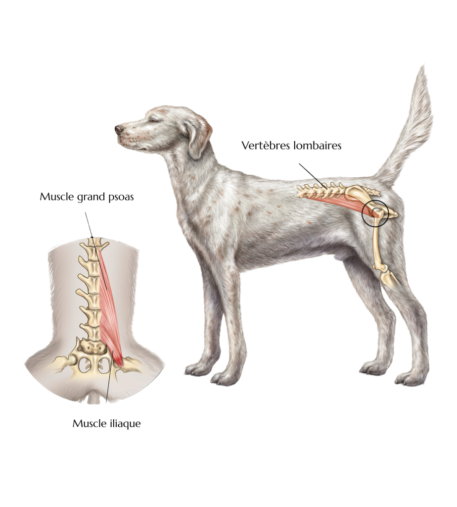 L’atteinte du muscle iliopsoas se produit lors d’une extension excessive de celui-ci et plus particulièrement lors des exercices comme les slaloms, les sauts nécessitant une forte extension des postérieurs et donc de la hanche ; ou encore des courbes serrées où le chien peut glisser. Les signes cliniques peuvent varier d’une sensibilité à une boiterie immédiate du membre atteint selon la gravité des lésions.
